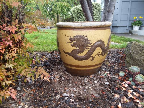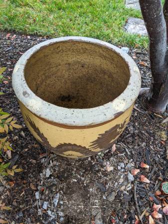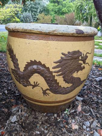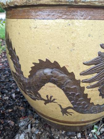 This 100-year-old jardiniere depicts a raised dragon figure in brown and ochre glaze. Overall good condition with some weathering and scuffs, and imperfections inherent in firing. No cracks, some...