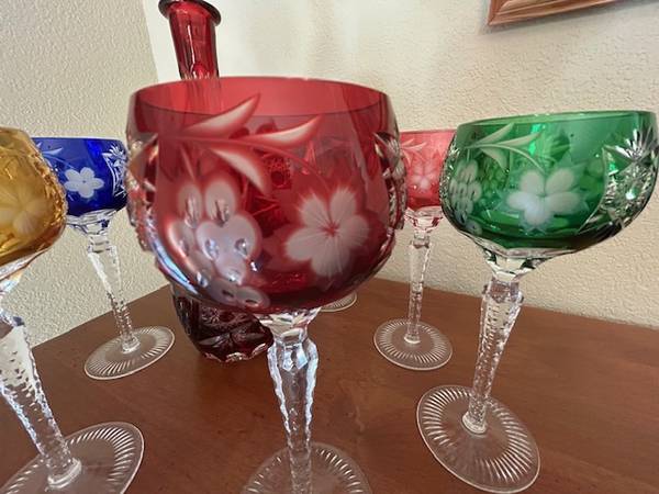 Set of 6 intricately designed crystal wine glasses in various colors with decanter. Glasses = 8 1/2 in. tall; decanter = 15 1/2 in. tall