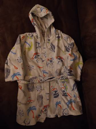 This robe made it easier and more comfortable for my son to dry off (vs. a towel) White robe with pirate designs Has 2 front pockets; belt is attached at the back so it won't get lost 100% cotton...