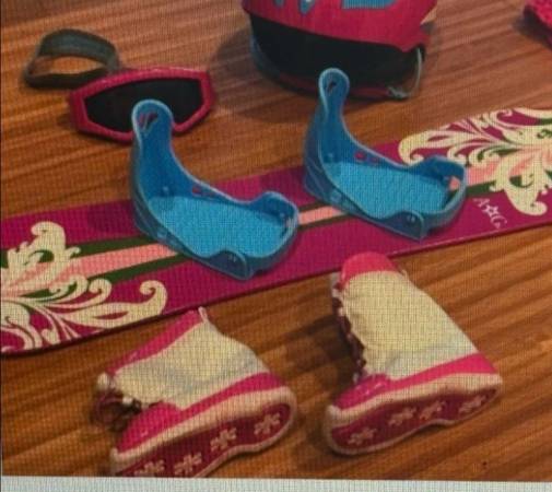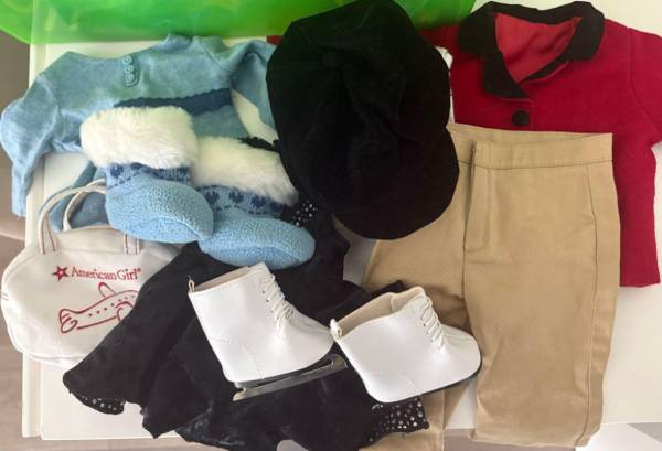 Bundling and selling together Includes snowboard set, soccer outfit, blue pajama outfit, ice skating set, and equestrian outfit. Includes various outfits and accessories for American Girl 18 inch...