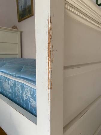 The bed frame posts have wear from the trundle moving underneath. One bed frame posts on has some damage on the outside from one cat scratching.
