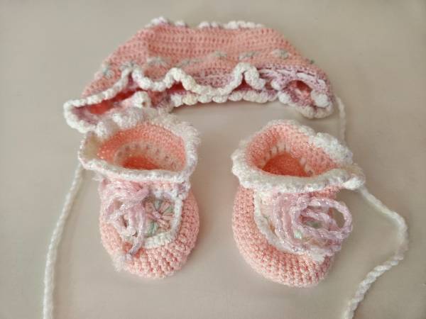 MATCHING KNIT BOOTIES AND BONNET NEWBORN SIZE IN PINK $10.00 CASH