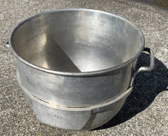 This is a group of agitators and a tin plated steel bowl for a large planetary mixer. These don't look like Hobart items, but are parts for one a competitive similar make. The bowl holds 50 quarts. It measures about 17" across the top rim. The paddles and wire whip measure about 23" long and 9 1/2" across. All pieces are in very good usable condition.