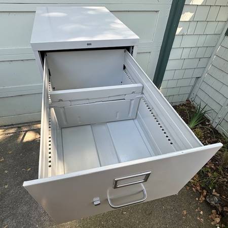 HON 314 Series 4-Drawer Vertical File Cabinet, Legal-size is used but very well-kept. Steel HON file cabinet is ‘Putty’ color, sturdy with vertical reinforcement, made in USA. Cabinet is 18” W x 25” D x 52” H. Drawers provide 22-1/2” of filing depth. It is suitable for standard and legal-size folders. Drawers have smooth glide. Full-suspension drawers open and close quietly, easily. Each drawer has an aluminum handle and thumb latch that holds it firmly closed. High drawer sides hold hanging file folders. There’s an adjustable ‘follower’ plate in each one to keep files upright. Aluminum face panel label holders have drop-in slots for easy label change-out. Individual drawers can be removed as necessary. Thermal-set enamel coating has been maintained well – only minor scuffs and some scratches from normal use, but no rust. It has a ‘knock-out’ for optional security lock installation (not included.) New cabinet retails on-line for over $800; respectable savings here, and available for local pick-up in San Rafael, cash, Venmo, or PayPal.