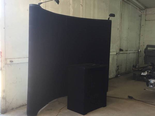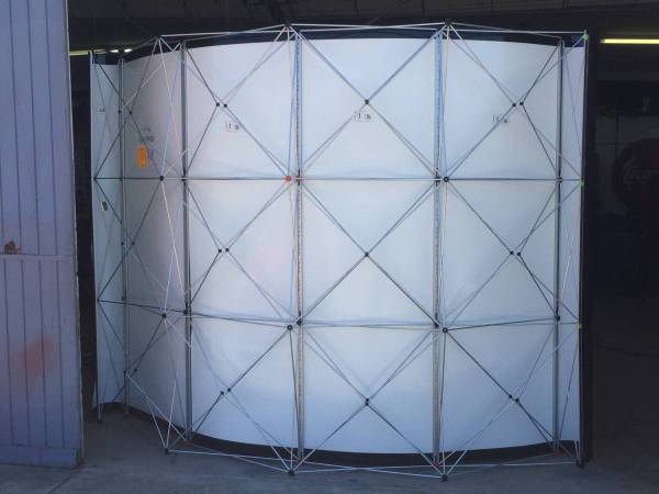 Instant pop-up 10' x 8' trade show display manufactured by Nomadic Displays. The very light weight aluminum curved pop-up wall frame and two heavy duty storage/travel cases are in good shape. It could be used as is but the black fabric cover could use replacing and one of the magnetic struts (see last photo) that the fabric cover attaches to needs to be replaced. I will set it up so you can see it.