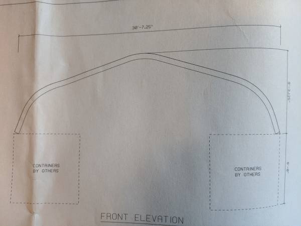 Brand new roof system for use over two 20' containers, see pics, all hardware included. Comes with a stamped set of engineering plans for California as well. Pics tell it all. Currently on a couple...