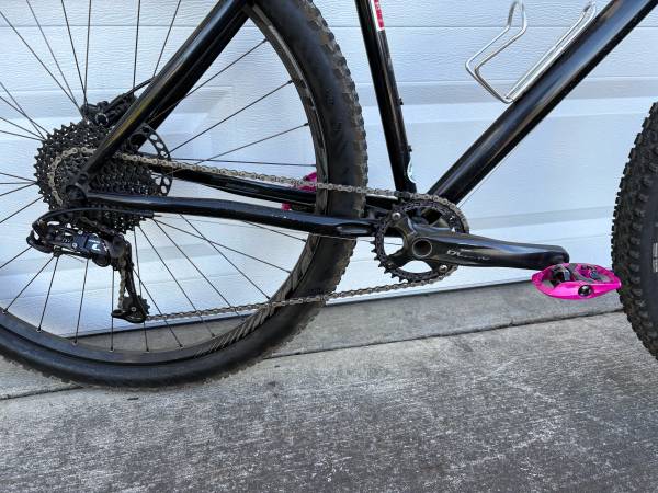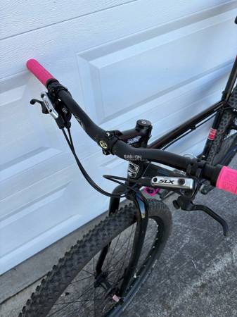 I just had it dialed in with a full tune up at Spoke Folk, so it’s ready for the next rider. 1 x 10 SRAM drivetrain. Shimano hydrologic disc brakes. Rims and tires are tubeless ready, I just prefer tubes, so they have tubes installed. I can install flat pedals instead of clipless if you prefer. Also have a shorter stem if you’d prefer.