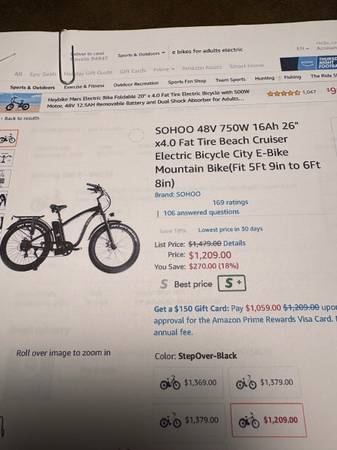 Sohoo 48V 750W 26" X 4.0 fat tires city/mountain...cruiser Purchased Dec '23...paid $1400.00. have only put 400 miles on bike. In excellent condition. Up grading to full suspension trail bike. Have...