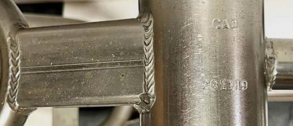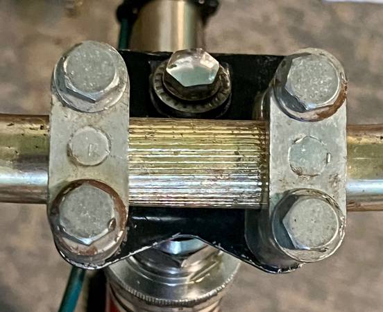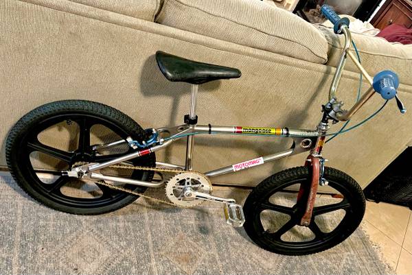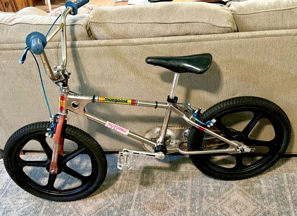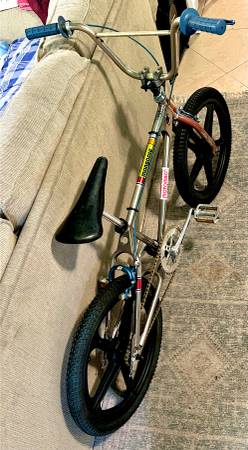 Mongoose Moto Mag Frame in Nickel dated January 1980. Has very small hairline cracks at seat mast keyway & some chainrub, small scratches & imperfections as shown. otherwise in nice survivor condition. Original finish Tange pinched drop out forks dated 9k November 1979. Original mongoose stamped headset. Reproduction decals. Slant stem with original mongoose clamps, Vintage candy gold bars, Vintage Pro Waffle grips, OG skyway Tuff II mags, snake belly style tires,, Sugino Super Maxy Forged 3 piece cranks w/ original blue inlays, Pro Neck chainring SR pedals,, ODI Mushrooms 🍄 Style bottom bracket bearing cover. Vintage Blue anodized Dia Compe brakeset & levers. Vintage Tuf neck seat clamp, fluted alloy post, Italian racing saddle. SWEET Bike! I have a NOS blue oval Neal Number plate to include with the bike as well 😎 SERIOUS ONLY Please 🙏 Thanks
