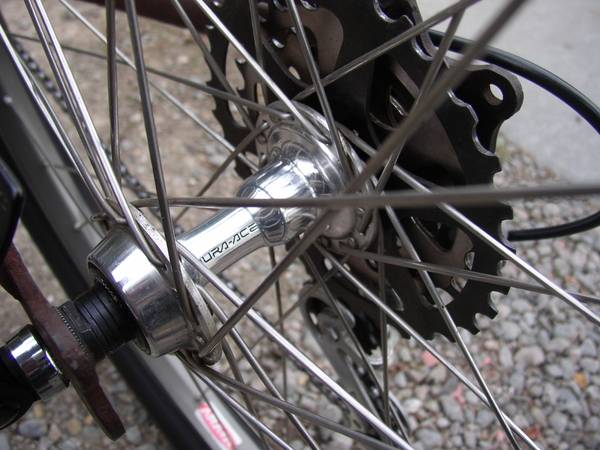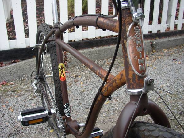 built with a new headset, bottom bracket, 175mm Cro-Mo crank, Schwinn sprocket, 6 speed freewheel, Shimano hubs, Suntour derailleur, dark alloy rims, stainless spokes...
