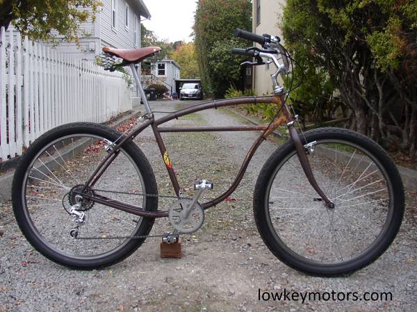 1950 Schwinn Straight Bar 6 Speed LKM Limited Edition late 1970's Tam Tribute Klunker, tamBomber, cruiser, kustom in distressed original Dark Red and Ivory paint...this frame was ridden on Mt.Tam by one of the Redwood High hooligans, and also visited Burning Man 2002 and has the sticker proudly shown...