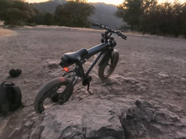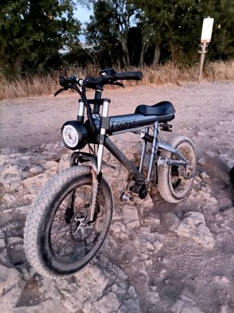 This unique e bike is powered by a Bafang BBSHD mid motor rather than your typical hub motor. It has an aluminum alloy frame, full suspension, a big 48V/25Ah battery, and 20x4" fat tire wheels. Drivetrain has been upgraded with an 11-32T freewheel and a shimano "sora" derailleur for better gear range and more reliable shifting. It has upgraded 203mm hydraulic disc brakes and stops on a dime. Retains fully functional head/tail/stop lights for safe riding at night.