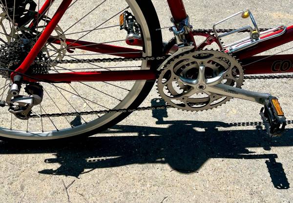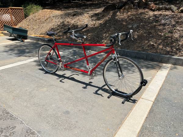 Co-Motion Cycles describes this bike as their Ultimate Touring Tandem. This model has Shimano Ultegra shifters and front derailleur with a Shimano XTR rear derailleur. The frame size is suitable for a taller captain (5’ 11”+) and a taller stoker (5’ 6”+). The bike rides smooth and is in excellent condition. $1350.