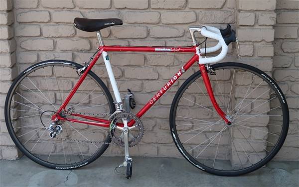 Centurion Ironman constructed with double butted Tange #1 cromoly tubes with sharp-looking lugs. 12 speed equipped with Shimano 600 downtube shifters, front derailleur and double cranks, Biopace chainrings, Shimano 600 SIS rear derailleur, Shimano 600 single pivot brake calipers and Dia-Compe areo brake levers, with original non-stretched chain!, New cables, housing, and new handle bar tape for your riding pleasure. Seat tube is 49cm center to center so it will fit riders from ~5'0 to 5'3. A great all around road bike for recreational riding and long distance commuting. Completely tuned and inspected, ready to ride!