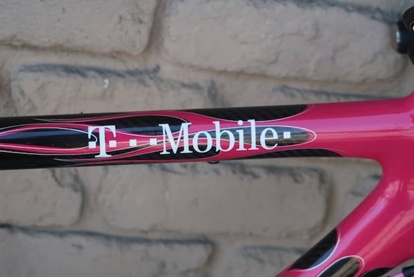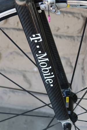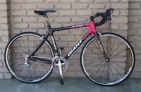 Get ready to get some miles under your belt on a barely ridden and wicked fast Giant T-Mobile. Carbon fiber frame and fork provide a light and compliant yet responsive ride. Set up with Shimano Ultegra 2x10 speed integrated shifter levers, Ultegra derailleurs and Ultegra double cranks. Dual-pivot Ultegra brakes for plenty of stopping power. Rolling on a 700c Mavic Ksyrium Elite wheelset wrapped in Specialized Roubaix Road tires. Comfy short Specialized stem and FSA handlebars.
