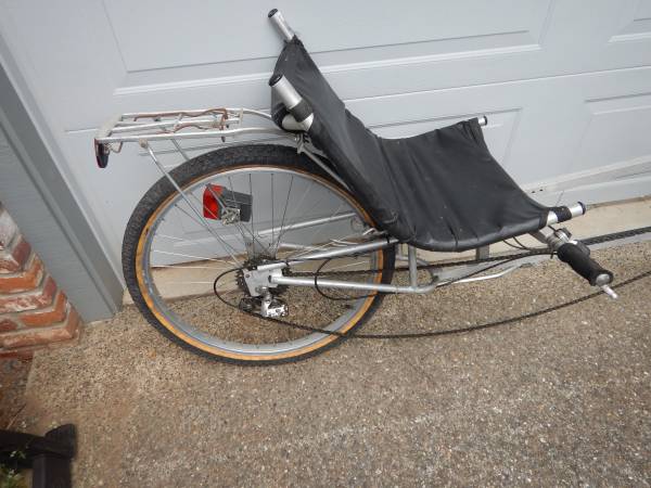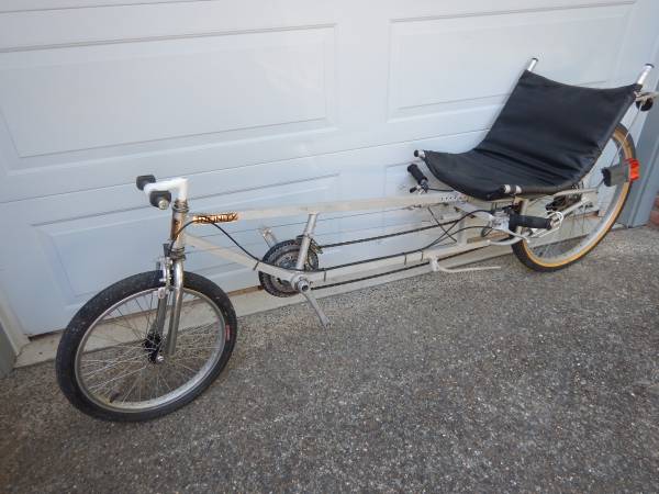 1990's Infinity long-wheelbase recumbent bicycle. Made by Ace Tool & Engineering. Triple cranks. 20" front wheel, 26" rear wheel, aluminum frame, chromoly fork, with rack, kickstand, light and...