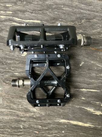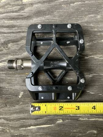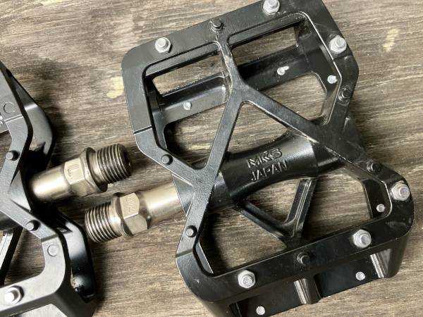 Japanese made aluminum platform pedals with super smooth, long-spinning bearings. Replaceable steel grip pins. Barely used.