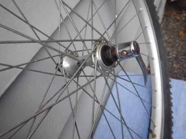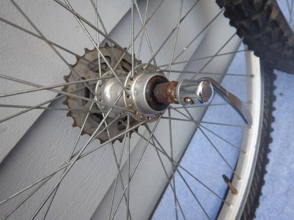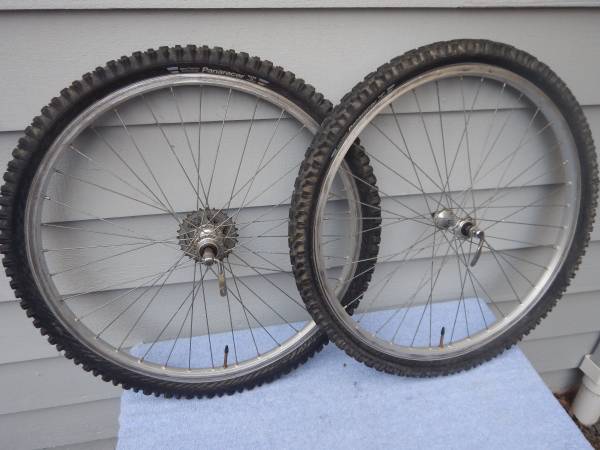 Matched Araya mountain bike 26" wheels. 7-speed. Rims are 26" X 1.50 Mavic 221 clincher hoops (silver). 36-hole front and rear. Includes the 7-speed Shimano cassette (12-28). Matched hoops, Shimano low flange hubs are nice and smooth, includes the quick releases. Rim brake. Drilled for Schraeder valves (but have Presta tubes in them right now). Rear spacing is 135-mm. Great condition, the hubs and freewheel turn nice and smooth. Both wheels spin smooth, both are round and true, work great. Nice 7-speed wheels. Includes a nice set of Panaracer 26 X 2.1 tires with tubes. $75. vintage mountain bike, bicycle, seven speed
