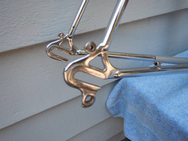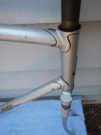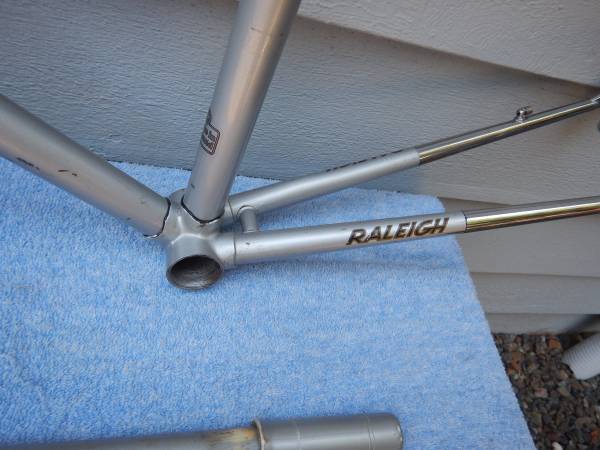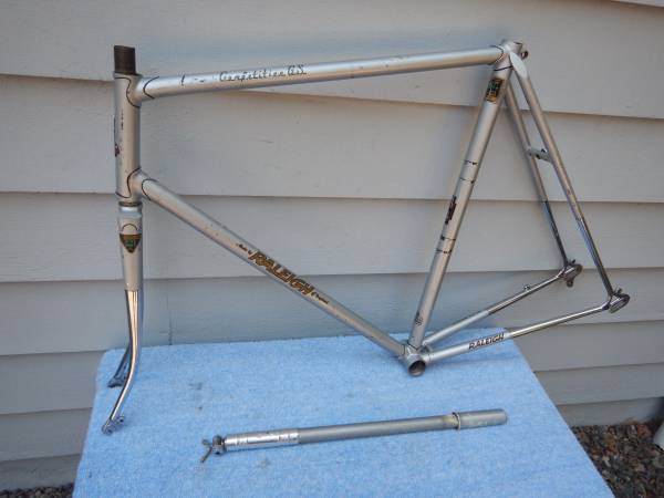Pretty 58-cm Raleigh Competition G.S. Reyonolds 531 double butted lugged vintage road racing frameset. 58cm center to center on the seat tube, top tube is 57cm center to center, head tube is 169mm. Rear spacing is 125mm. Nice cut-out lugs, chromed stays, Campagnolo dropouts, Silca color matched Campy head bike pump, metal head badge, horizontal dropouts. Original fork. No crashes, cool 50-year old frameset. $245