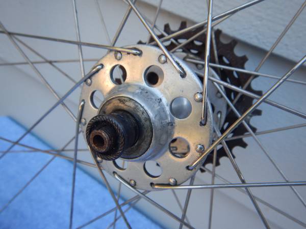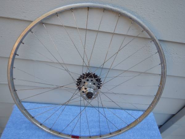 Used Vintage Campagnolo Nuovo Tipo 700C road or touring bike rear wheel. Rim is Mavic vintage red label 700C double wall clincher hoop, alloy, (silver). 36-hole. Campagnolo "Nuovo Tipo" high flange hub. Includes the 6-speed Shimano freewheel (14-28). The Campy hub is nice and smooth, no quick release. Drilled for Schrader valve. Stainless spokes. Rear spacing approx. 126-mm. It could use a good cleaning, still good shape, some normal wear, the hub and freewheel turn smooth, the wheel is round and true. $65. I can ship too, if you want. wheels, wheelset