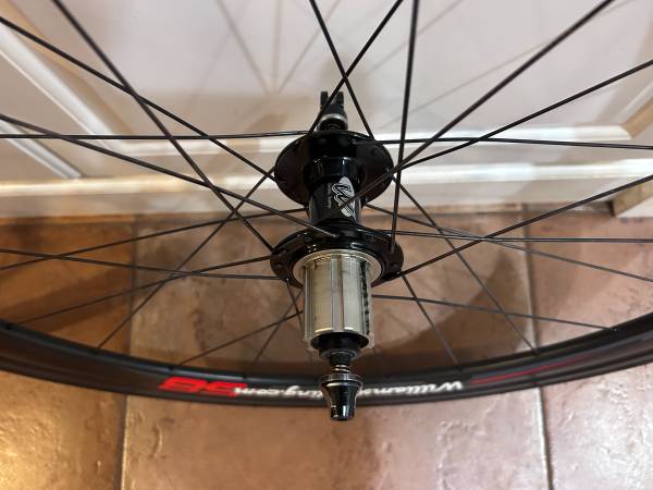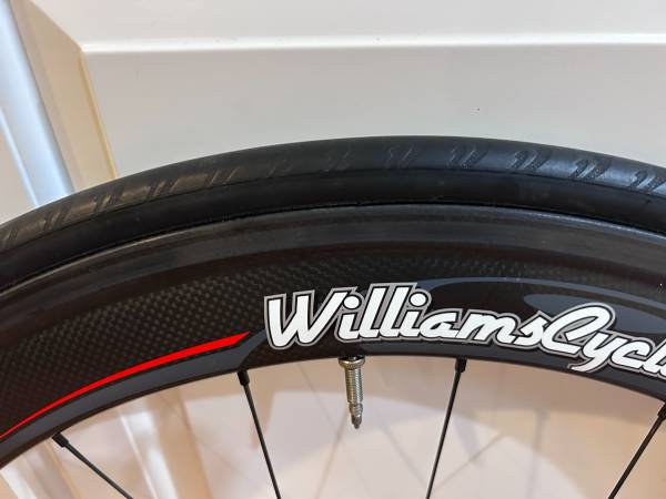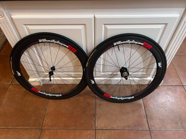 Up for sale is a set of like new Williams 58 carbon clinchers, rim brake, with ceramic bearings. Running a set of Continental Ultra Race tires not cracking but older, not worth me taking them off, have a few hundred miles left. Campagnolo hub currently, you could convert over to hg freehub if wanted. These were my spare set for a 10 speed campy groupo.