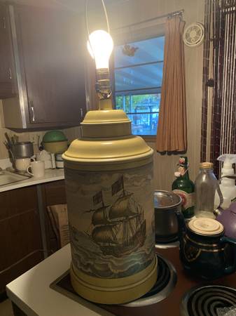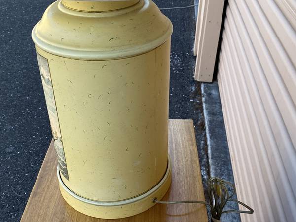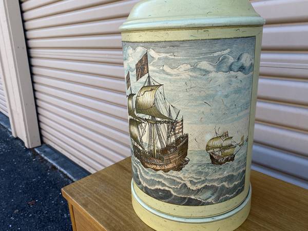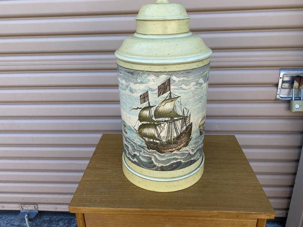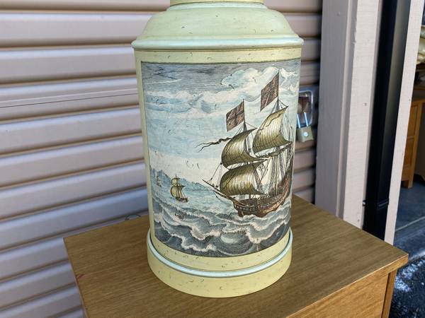 Beautiful vintage round tall table lamp with wonderful nautical motifs featuring old sailing ships, waves and skies, printed on textured material. The lamp body is made from metal and has a great heavy weight to it. Total height to top of shade is 30", the lamp is approx, 10" in diameter. In excellent condition, works fine.