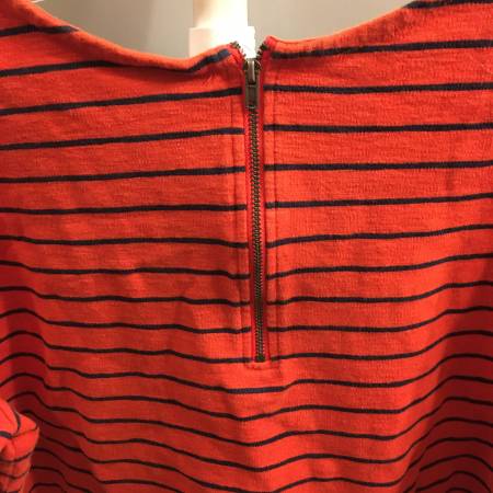 Selling a used Merona Women's Scoop Neck Knit Tunic Top in great condition no rips or stains. Shirt is made off 97% Cotton and 3% Spandex and is machine washable sleeve's are not long they are 3/4 long and back zipper is 6.5" long and works great. Size is XL and color is Red With Blue Stripes. If you have any questions or interested email me with your contact info and I will get back to you. Available for shipping if needed.
