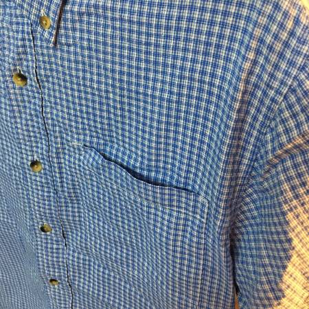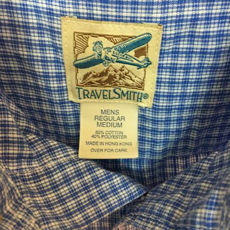 Selling a used Travelsmith Men's Short Sleeve Button Down Plaid Shirt in great condition no rips or stains all buttons are there. Shirt is made of 60% cotton and 40% polyester and is machine washable, Shirt features 1 left side chest pocket and is size Medium and color is Blue and White comes from a smoke free home. If you have any questions or interested email me with your contact info and I will get back to you. Available for shipping if needed.