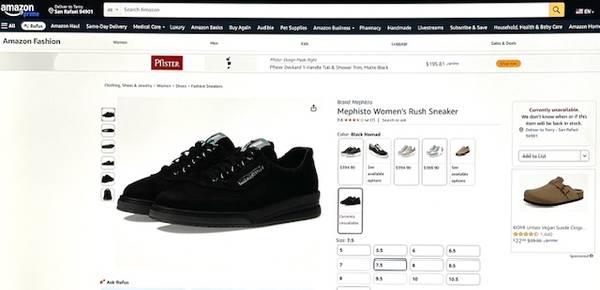 ‘Mephisto, the ultimate grandpa brand, is suddenly, improbably cool. Once the butt of jokes about aging ungracefully, the 59-year-old French shoemaker has become an It-girl and It-boy favorite, producing footwear as treasured for its comfort as for its stubbornly unfashionable authenticity. With orthopedic soles, bulky profiles and a delicate retro label, Mephisto appears to be the last frontier in the exodus toward chunky, practical shoes that has propelled brands like Birkenstock and Crocs to global dominance.’) This style is somewhat limited in on-line availability, as is the range of sizes. Where available, a pair retails for about $395. This pair of Mephisto ‘Rush’ Walking Shoes, Women’s Size 7-1/2 in Black is available for local pick-up in San Rafael, cash, Venmo, or PayPal.