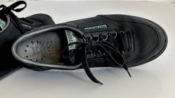 Mephisto ‘Rush’ Walking Shoes, Women’s Size 7-1/2 (5.5 UK) are of a standard G-width, in black Nubuck leather uppers w/padded collar, and rubber outsole (heel 1/-1/2” H.) Inside, they have breathable leather linings and removable ‘Runoff/Air Jet’ footbed. They are ‘lace-up using D-loops. This is one of Mephisto’s iconic shoes, stylish but restrained, made in France. The ‘Rush’ is built for longevity, and for comfort with the ‘soft-air’ insole that cushions impact and reduces strain on joints. The are built to circulate fresh air throughout the shoe, for all-day comfort. This pair has had very little ‘lived-in’ experience; they appear virtually as new but without retail packaging. (According to Wall Street Journal in a Jan 09,2025 article: