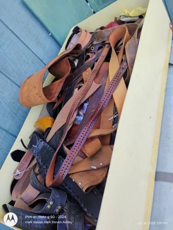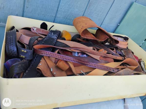 Former leather Crafter I used to use vintage belts and straps to create better vintage belts and straps haha like to see it go to a good home if you're looking for just belts with buckles I have a few not shown like white tooled belts things like that may trade for old vintage belt jewels glass prefer please leave a number to receive a response we can text later thank you spe the extra belts I have not shown will cost more of course