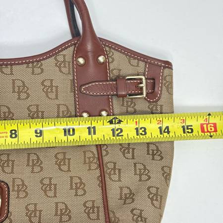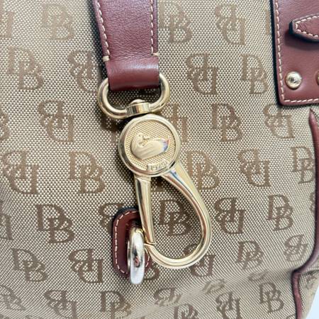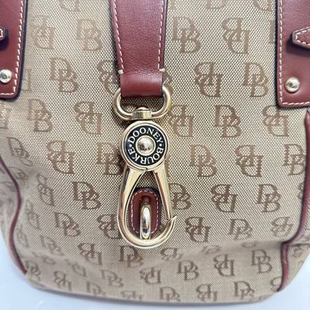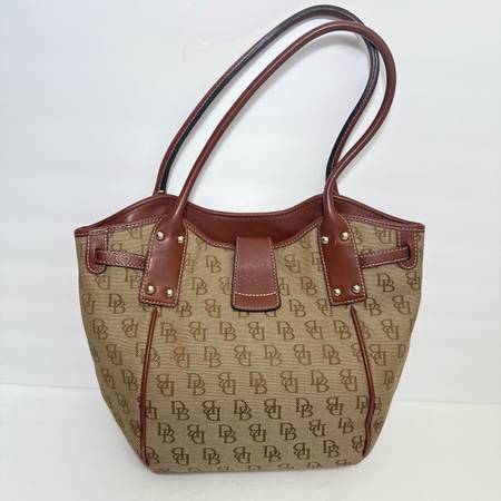 Vintage Y2K Dooney & Bourke Logo Canvas Tote Shoulder Bag with Leather Trim. Classic monogram DB print and bucket/tote silhouette.