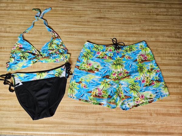 BLACK AND BLUE BIKINI WITH MATCHING SHORTS SIZE MEDIUM....$15.00