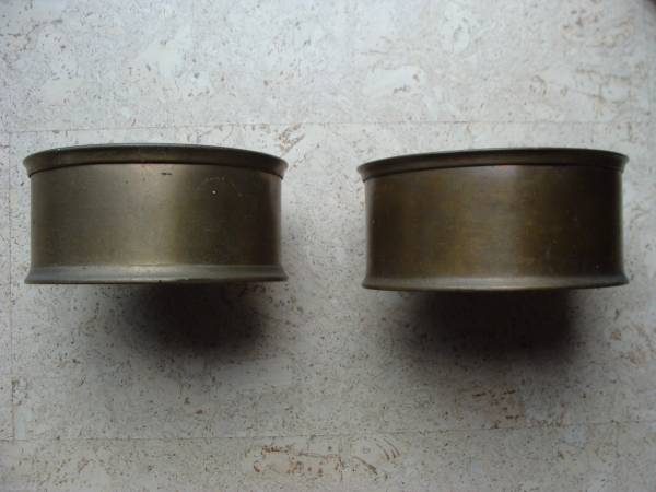 For your consideration is a pair of old Brass/Cast Iron Spittoons. They are used but in excellent condition. The base of the spittoon is cast iron for weighing it down and keeping it from sliding on the floor. Each spittoon weighs approximately 6 pounds. The brass body is in excellent condition with no visible damage. Dimensions are 8" diameter by 4" high.