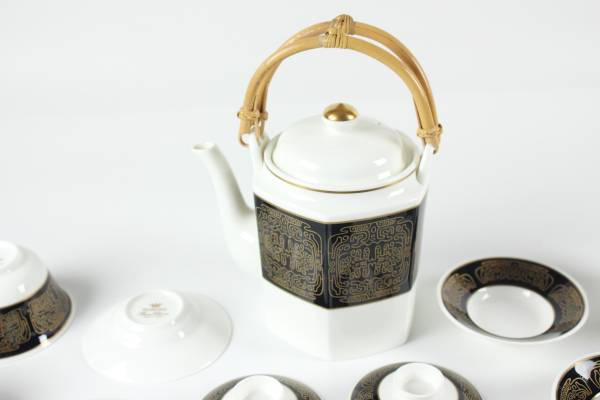 -Made from fine bone China -Elegant black and gold pattern design -Rattan handle for a classic touch -Made in Japan -Brand New in Perfect Condition!