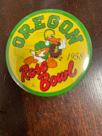 ~~ 1958 ROSE BOWL FOOTBALL PIN, U OF OREGON DUCKS VS OHIO STATE ~~ PIN IS 3" IN EXCELLENT CONDITION FEATURES COLORFUL AND GRAPHIC ARTWORK OF THE WALT DISNEY OREGON DUCKS MASCOT RUNNING WITH THE ROSE...