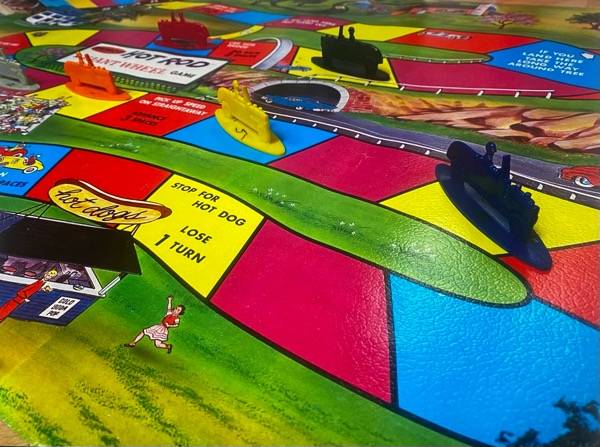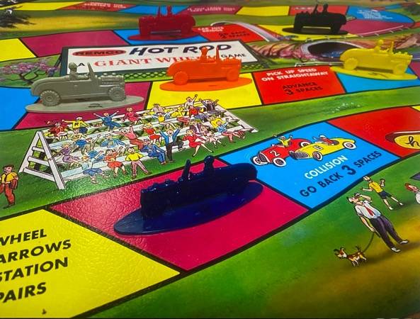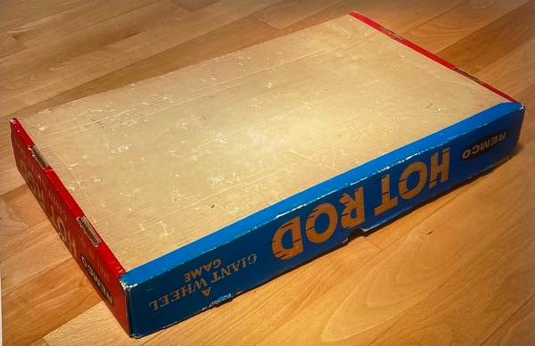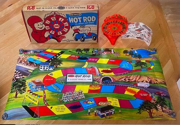 1960 Remco Hot Rod - The Sport Car Race Giant Wheel Game. This game's playmat has a copyright date of 1960. All original pieces are included - 47.5"x23.5" playmat with circular cardboard retainers, Spinning Wheel with stand, 6 hot rod shaped game pieces, playing instructions, inspection slip, and box.