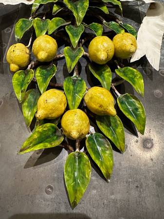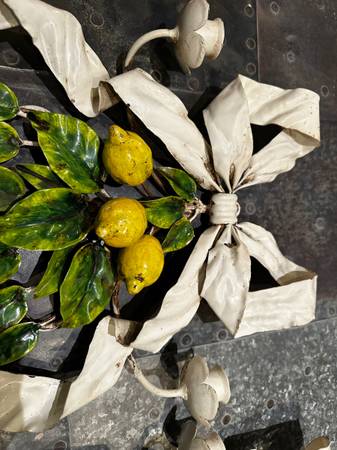 A very rare, hand made and painted pair of Italian lemon Fruit and leaf tole wall scones, dating from the 1950's.