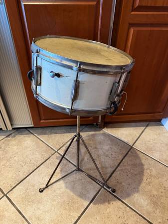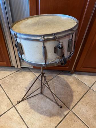 1950s Gretsch Broadcaster Snare with stand and home made wood case, also comes with straps for wearing.