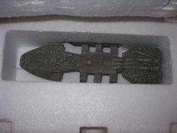 released in 1997. This is a hand painted, cold-cast porcelain replica of a Cylon Baseship measuring 5" in diameter and attached to heavy weighted base. Seal of Authenticity appears on bottom of the item's base. Comes in he original box with original packing.