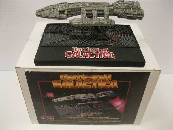 Fantastic 8" replica of the original series Battlestar Galactica, modeled by Ron Mendell and released in 1996. It is hand painted, cold-cast porcelain. No two are exactly alike. Seal of Authenticity appears on bottom of the item's base. Comes in the original box
