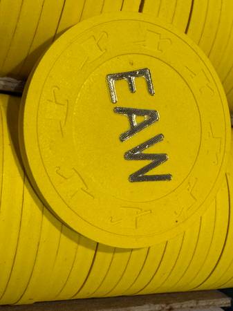 Vintage Clay yellow Poker Chips with "EAW" engraved and top hat and cane around perimeters. SHORT CANE VERSION. These look as new. 116 pcs total: 27 white chips 29 yellow chips 30 blue chips 30 red...