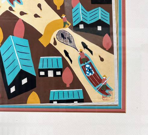 Framed Chinese Woodblock/Silkscreen Folk Art Village Scene Signed Seal 33x23. This is a vibrant framed Asian folk art painting depicting a colorful village scene with boats, houses, and trees. The piece is signed with an artist’s seal in the lower right corner (see close-up photo).