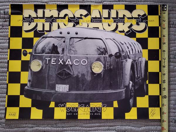Original 1st printing 20 x 14&7/8" concert poster for the Dinosaurs (featuring John Cipollina (Quicksilver Messenger Service), Robert Hunter (Grateful Dead), Spencer Dryden (Jefferson Airplane), Peter Albin (Big Brother & the Holding Company) and Barry Melton (Country Joe & the Fish) appearing at Wolfgang's in San Francisco, CA on 9/24/1983.