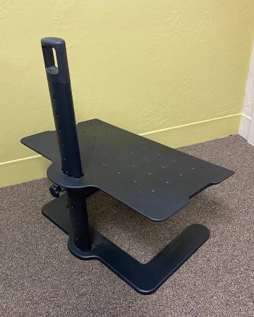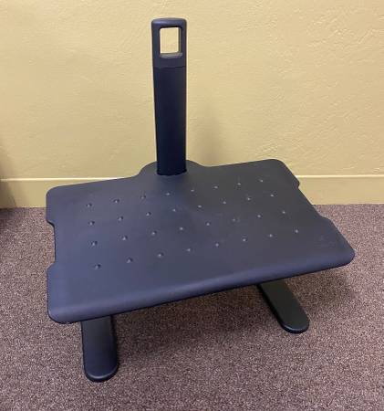 Fully adjustable desk footrest with near to no sign of use. New price on Amazon is $124. plus sales tax. Get it while you can! Low gloss black hard plastic with steel knob adjustment on the back....