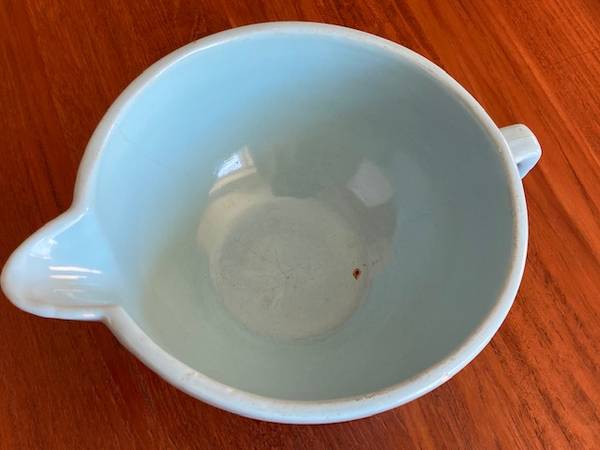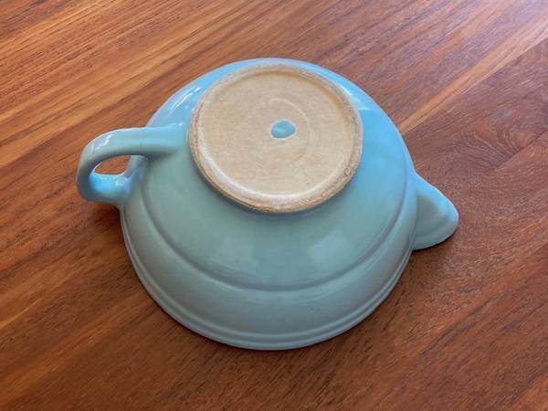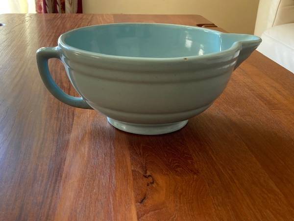This blue mid-century “batter bowl” is from the 1940s and very likely Bauer, but not positive because it's unmarked. Reflected in price.
