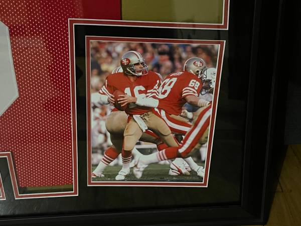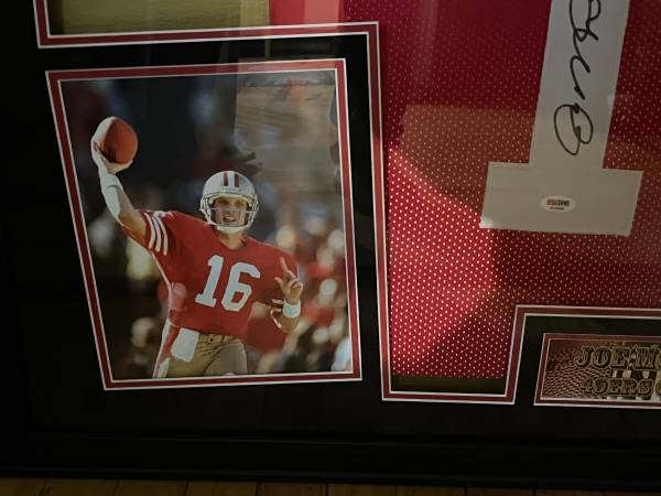Framed and SIGNED Joe Montana 49ers jersey. Includes COA from PSA/DNA.