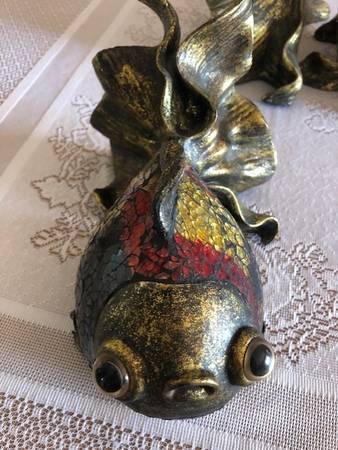 Mosaic Art Koi Fish with flowing tails. 9 inch long koi fish, dressed in gold, red and black glass mosaics. burnished gold tails and fins and face.