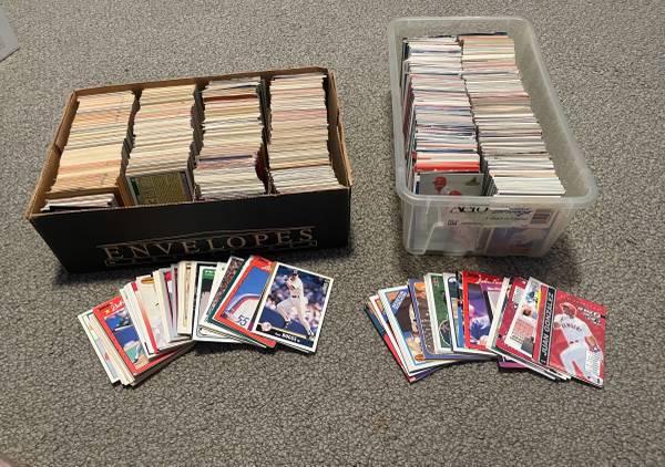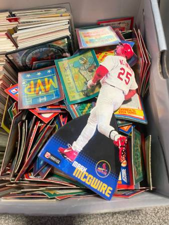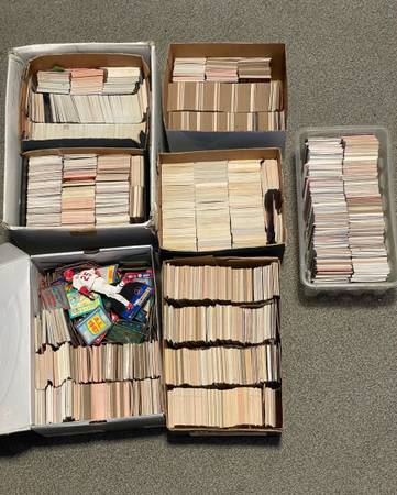 7 boxes of old baseball cards in great condition, all different cards, some are other sports like basketball and football. Some are sets and some are organized/labeled. It also has a lot of stickers, 3D graphics, and small cutouts. I have zero knowledge on anything sports, these cards were from my grandfather who passed away and these were in his closet. I only do pickups at police stations