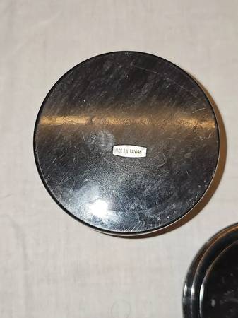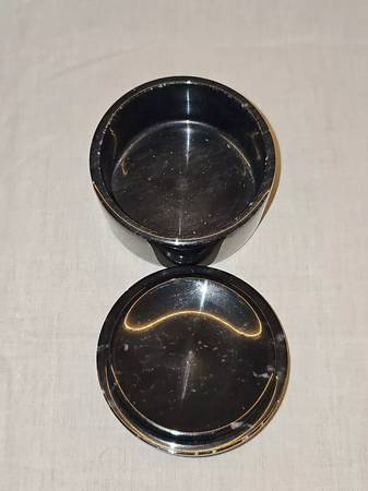 This vintage trinket box features a round black and white marble design with a silver grape cluster on the lid. Measuring 2 inches in height and 3 inches in width. Crafted in Taiwan, the box has a glossy finish. It's made of durable marble and can hold small items such as jewelry or trinkets. A perfect little gift!